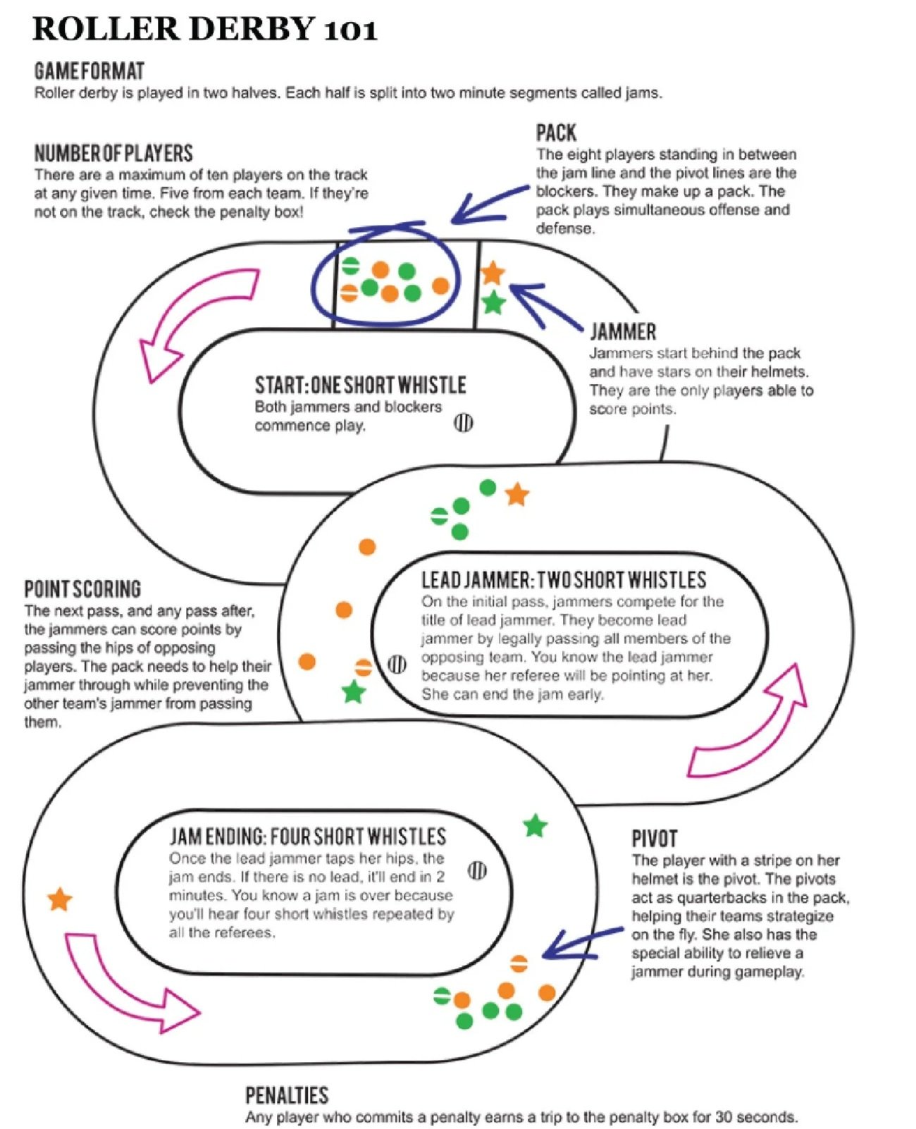 For a quick overview, watch this video or review the diagram to find out how roller derby is played.